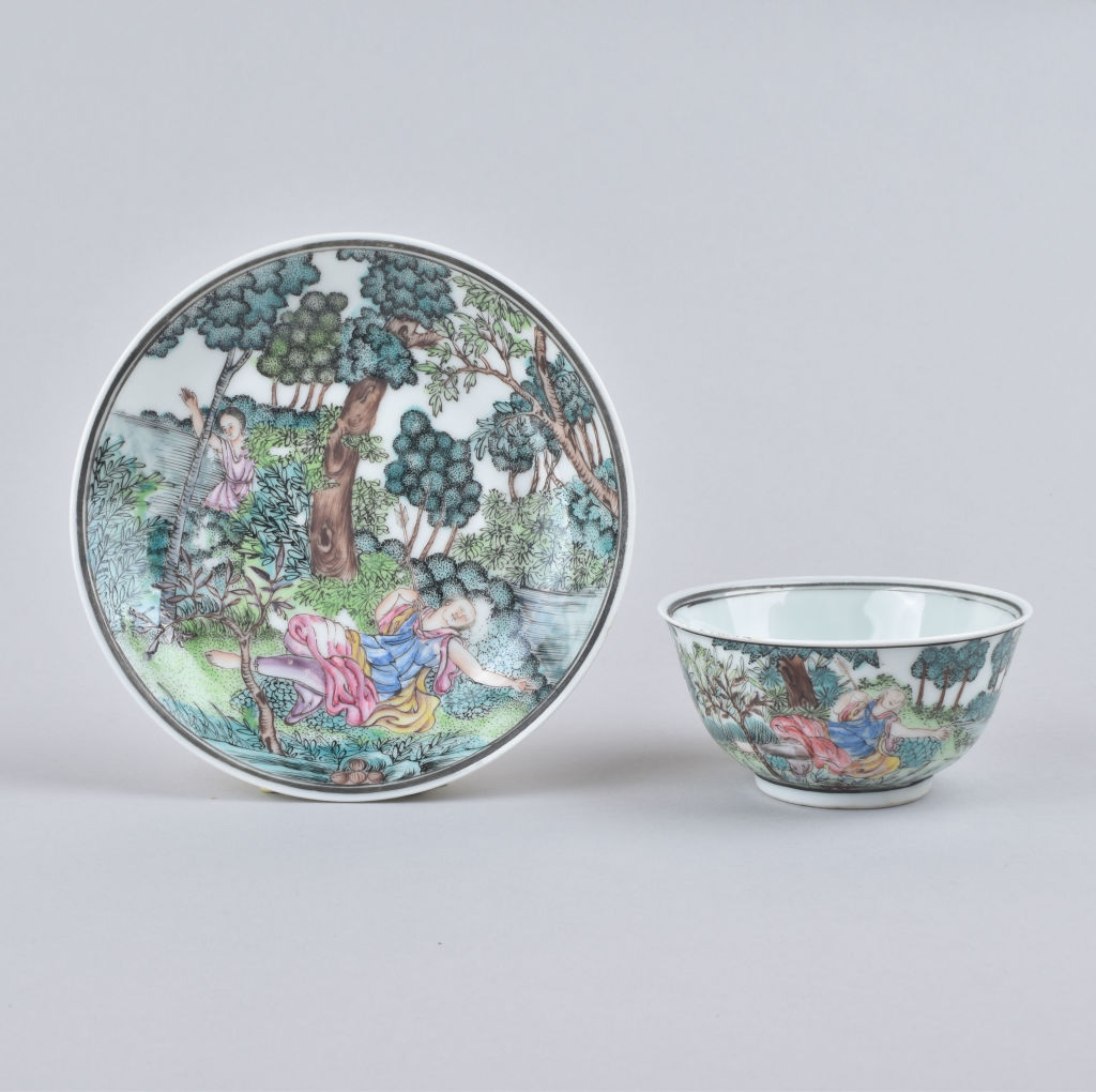 Decorated in the famille rose palette, with Procris dying in the woods, hit by an arrow of Céphalus, the scene being based on an illustration of S. Le Clerc for Les Métamorphoses d’Ovide en rondeaux by Issac de Bensérade (1676, p. 260).