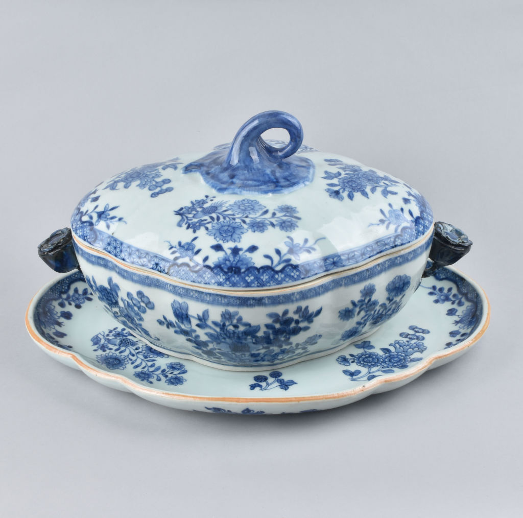A Chinese export blue and white tureen, cover and stand. Qianlong