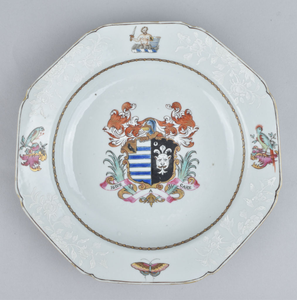 Decorated in the famille rose palette, the coats are of Hotham, Barry of ten argent and azure, on a canton or a Cornish though proper ; crest, A demi seaman issuing out of the water proper, holding in the dexter hand a flaming sword argent, hilt and pommel or, on the sinister arm a shield […]