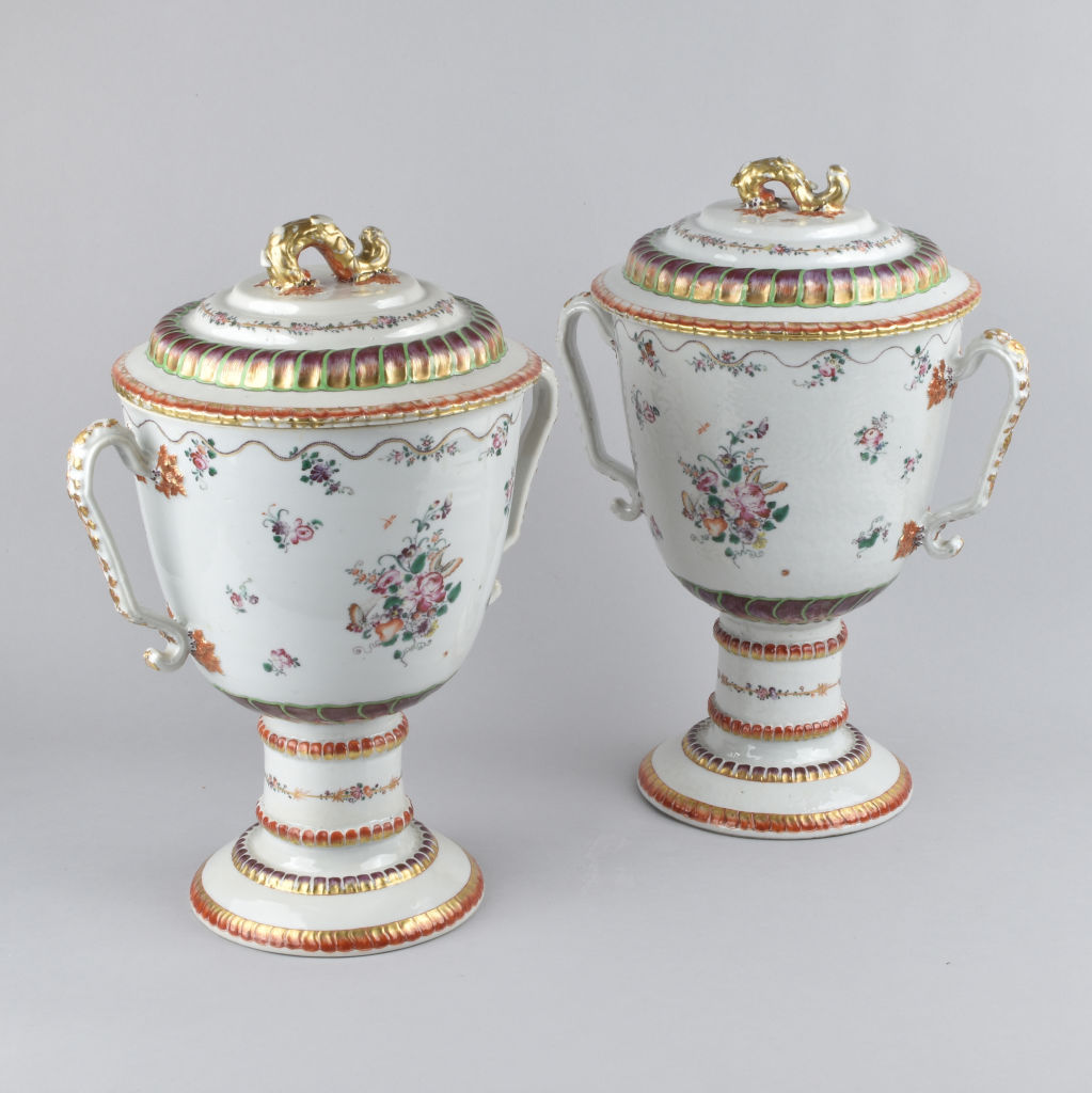 A pair of massive Chinese Export “loving cups” and covers decorated with flowers. Qianlong period