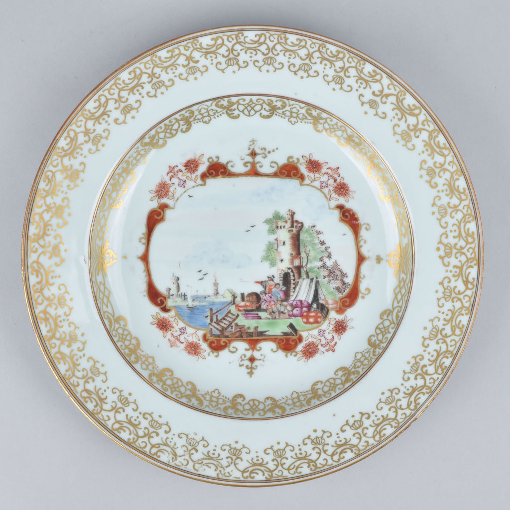 Decorated in the famille rose palette, in a central cartouche with stevedores before a fort on river bank, three similar forts and sailing boats in the distance, the rim decorated with a broad band of gilt scroll.