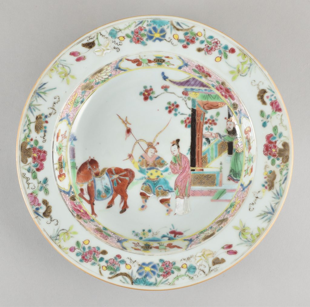 An unusual Chinese famille rose plate decorated with a European subject for the Spanish market. Qianlong period