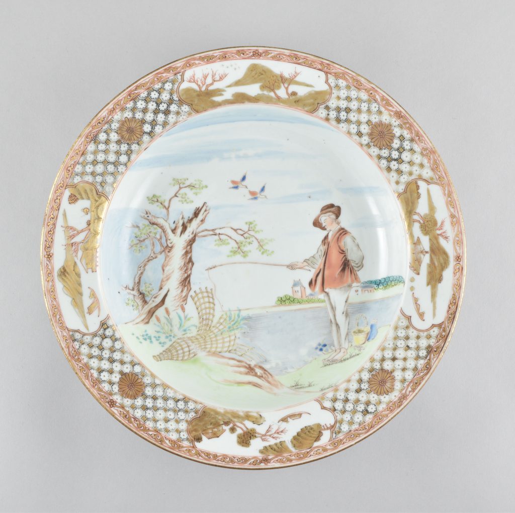 Decorated with a Dutch fisherman before traps and a tree trunk, the border gilt and grisaille enameled lattice-work with four reserve panels of Chinese-style gilt, grisaille, and iron-red mountains.