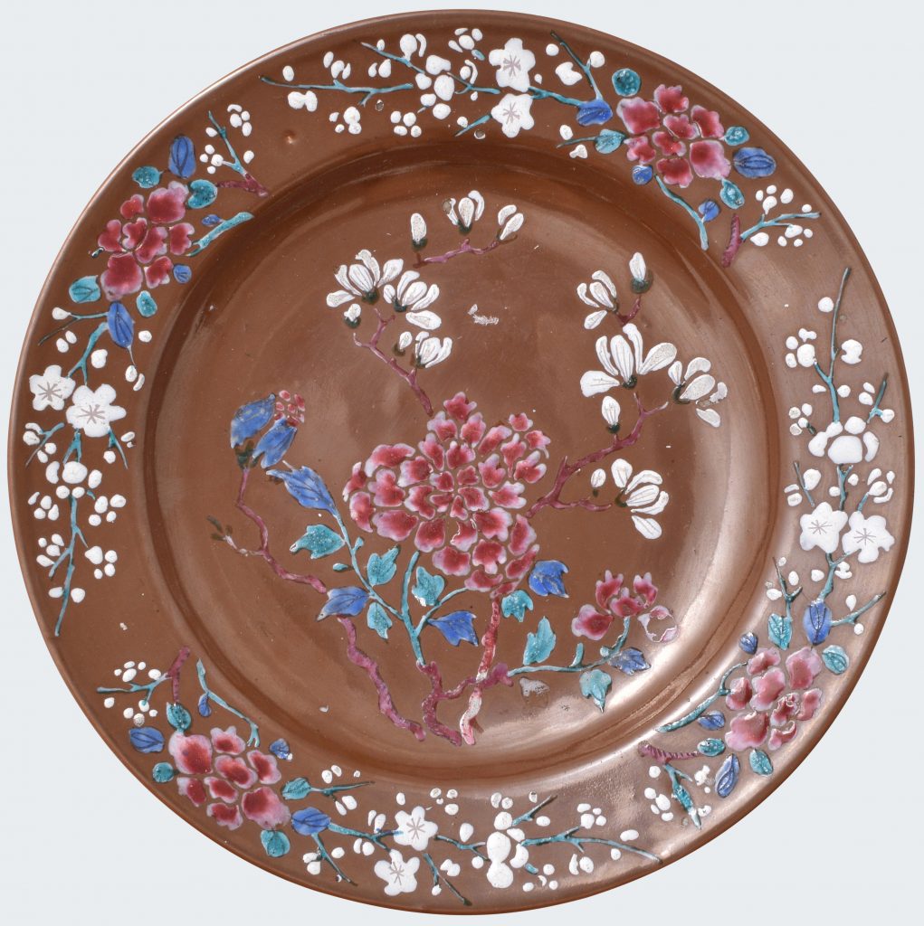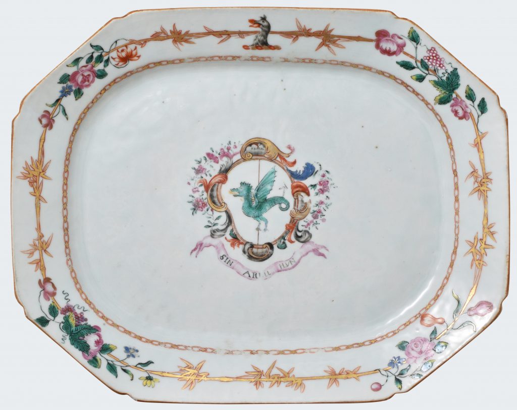 Decorated in the famille rose palette with a bamboo and floral border, the arms are of Wilkins, Per pale or and argent a wyvern vert, crest, A wyvern’s head erased; and motto “Sin ar du hun” (“Wonder at thyself”).