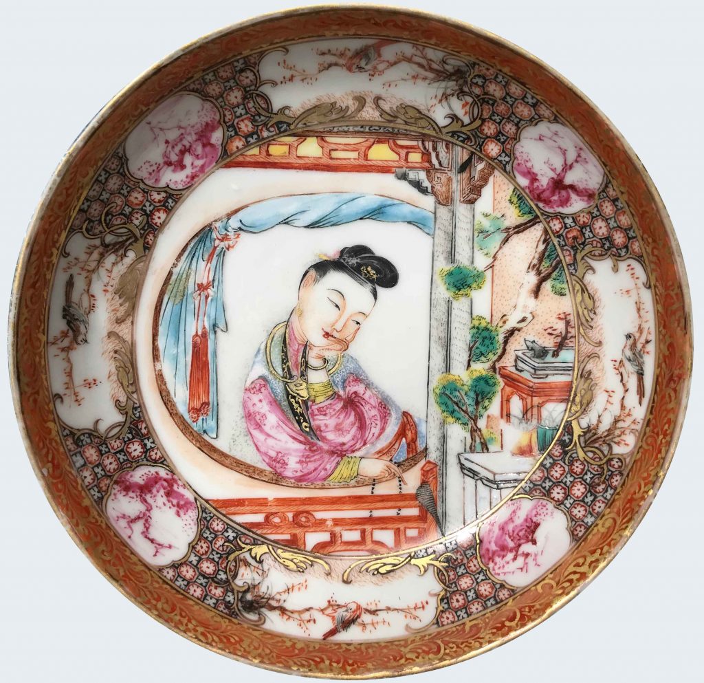 A Chinese famille rose tea bowl and saucer decorated with a lady. Qianlong period.