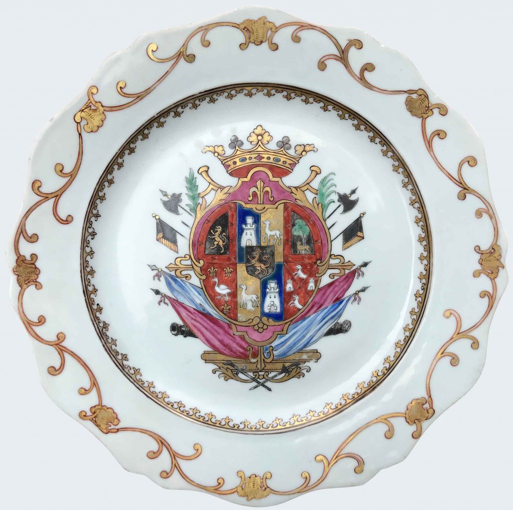 Enamelled in the famille rose palette and gilt with a central coat-of-arms for Raón y Guttiérrez, quarterly: 1. or, a gallows, in chief an arm holding a knife argent;2. azure, a tree with a wolf sable against the trunk; 3. or, four bends or and over-all a knife argent;4. azure, a tower argent between two […]