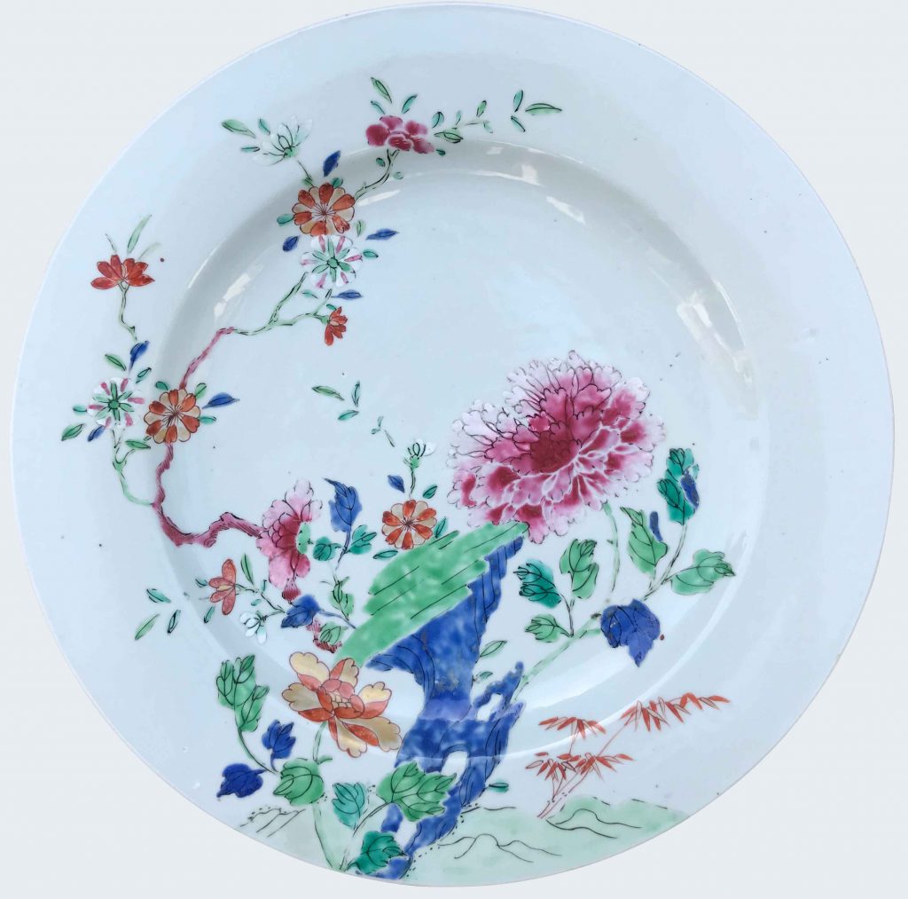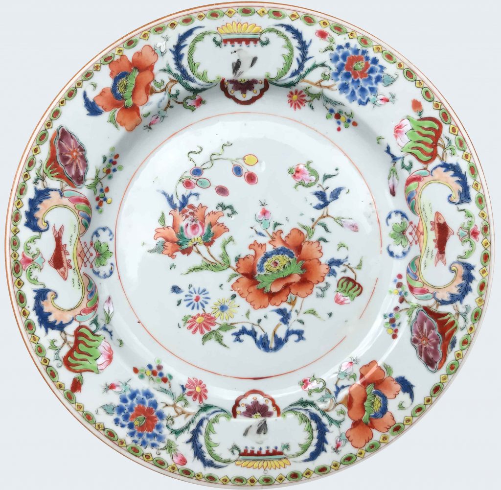 A set of three Chinese « Madame de Pompadour » polychrome plates. Qianlong period.
