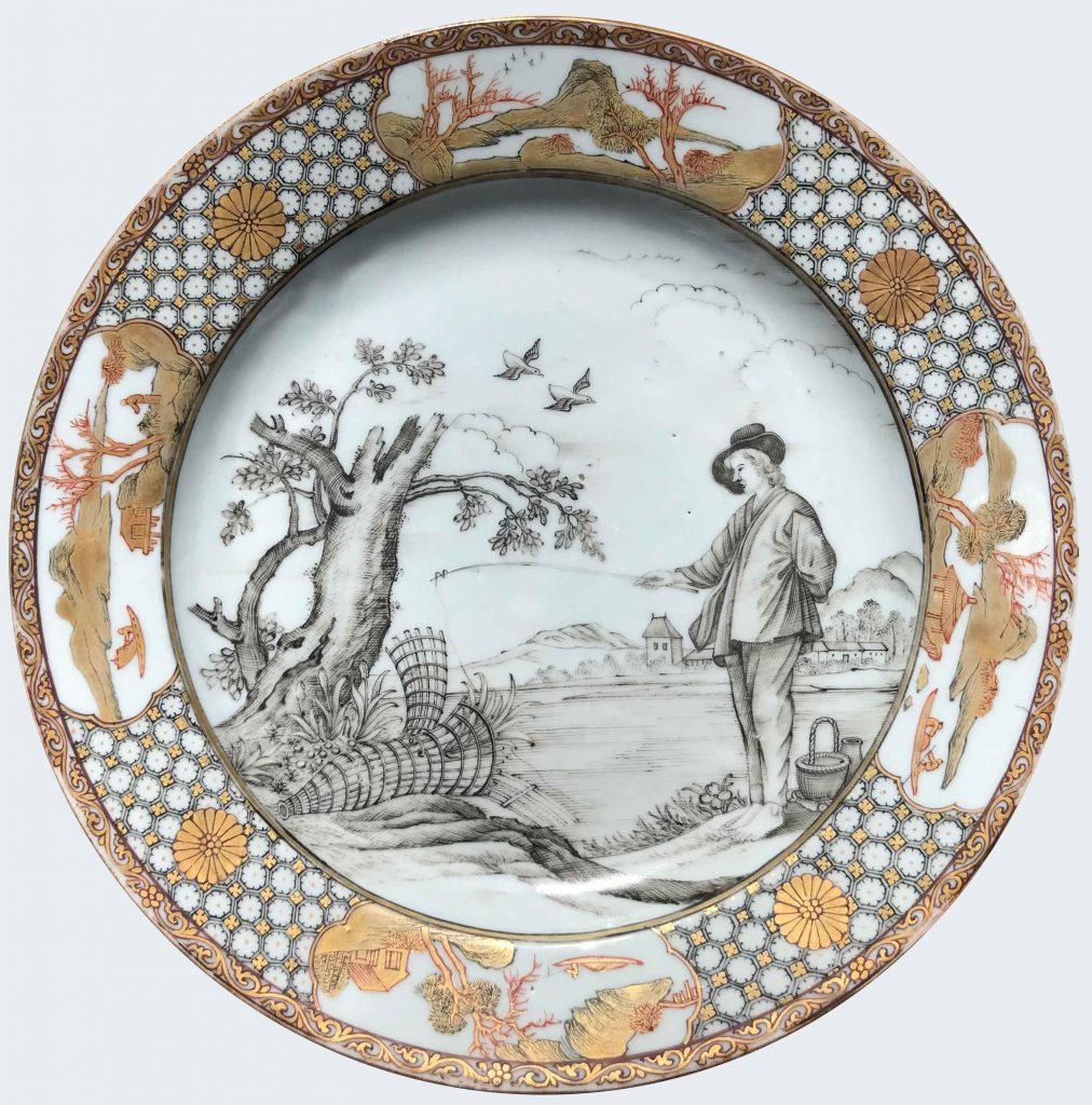 A Chinese en grisaille and gilt “Le pêcheur” plate. Qianlong period.