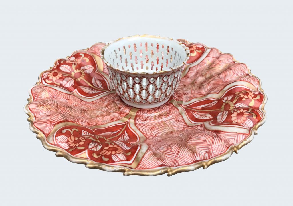Of octagonal form and decorated en grisaille and gilt with a central coat of arms, the dexter of Birkbeck, Argent a fess cherry or and azure between three lions heads gules (with an unusual crest), on a count’s coronet a demi lion rampant holding between the paws a cross pattée. The motto PATIENTIA VINCIT. The […]