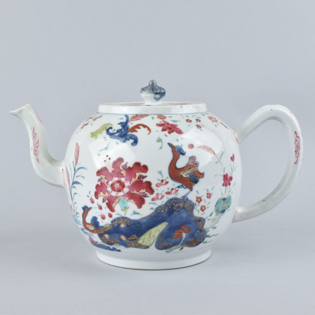 A massive Chinese famille rose “pseudo-tobacco leaf” wine pot. Qianlong period.