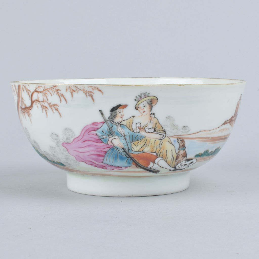 The bowl decorated in the famille rose palette with a couple resting after the hunt in a landscape.