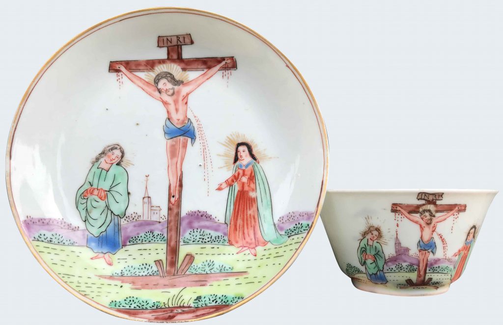 A Chinese Dutch-decorated tea bowl and saucer with the Crucifixion. Qianlong period.