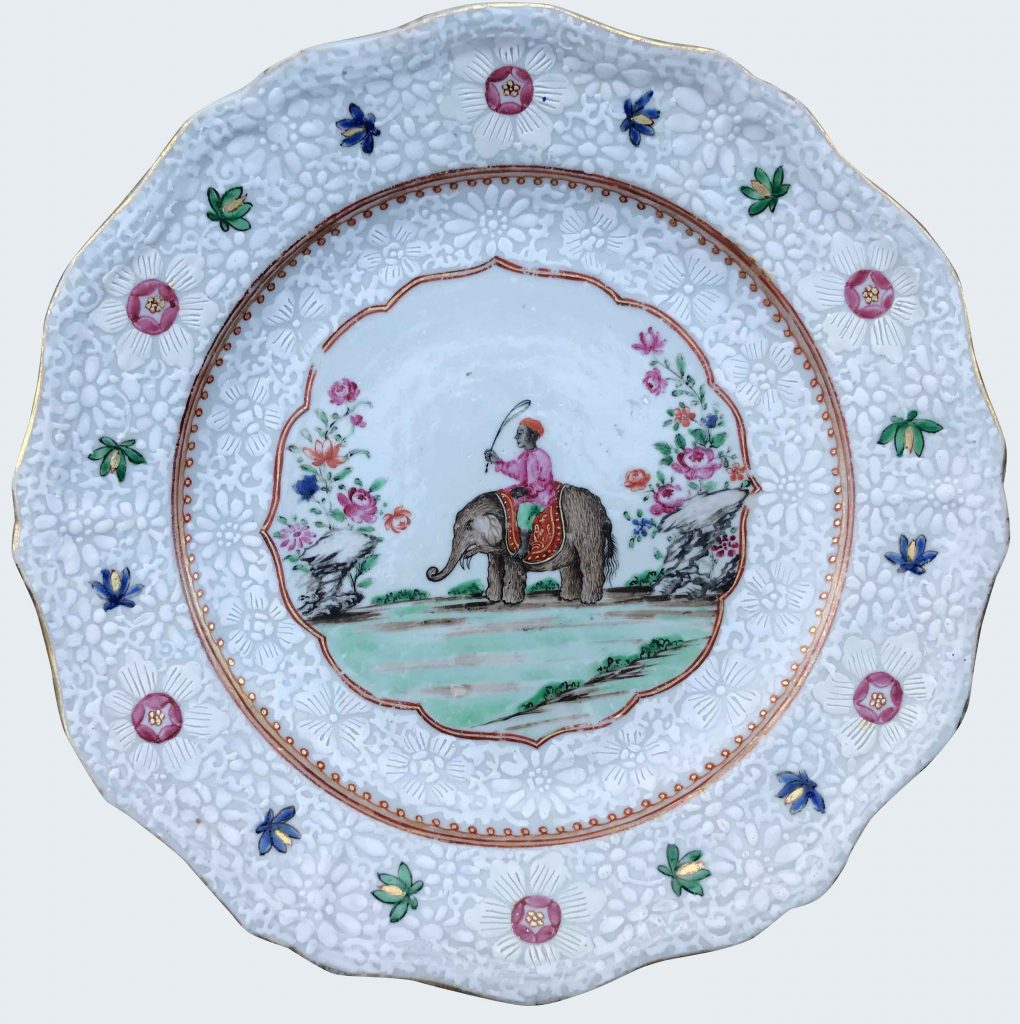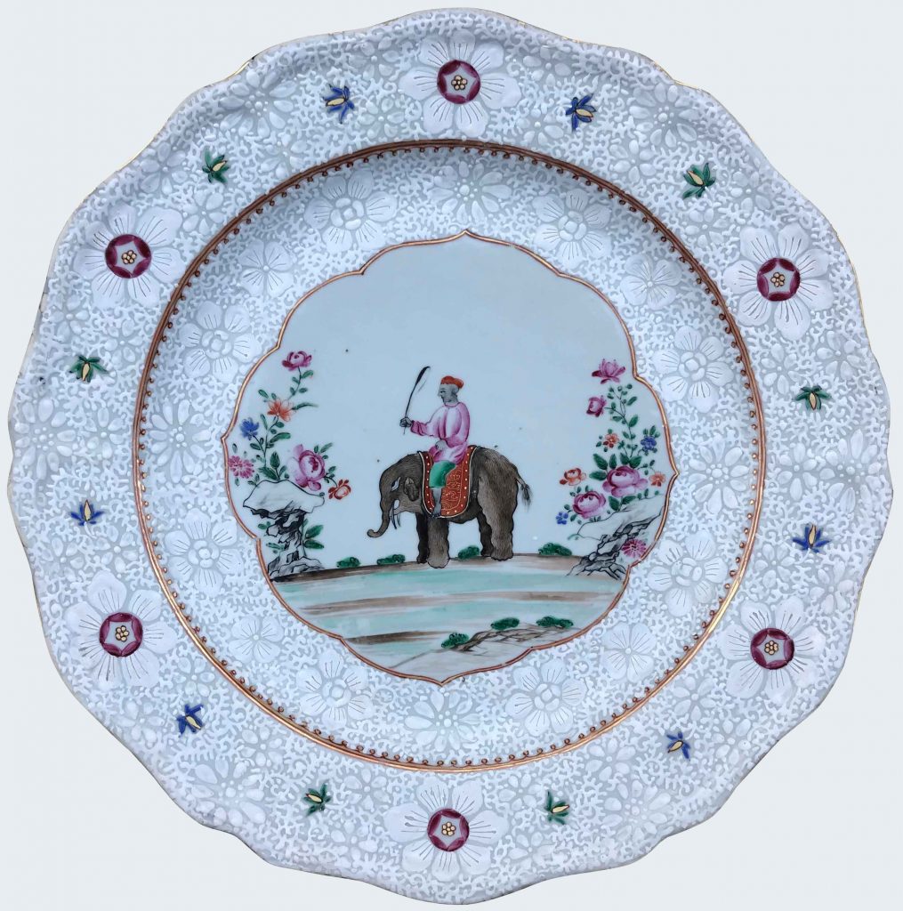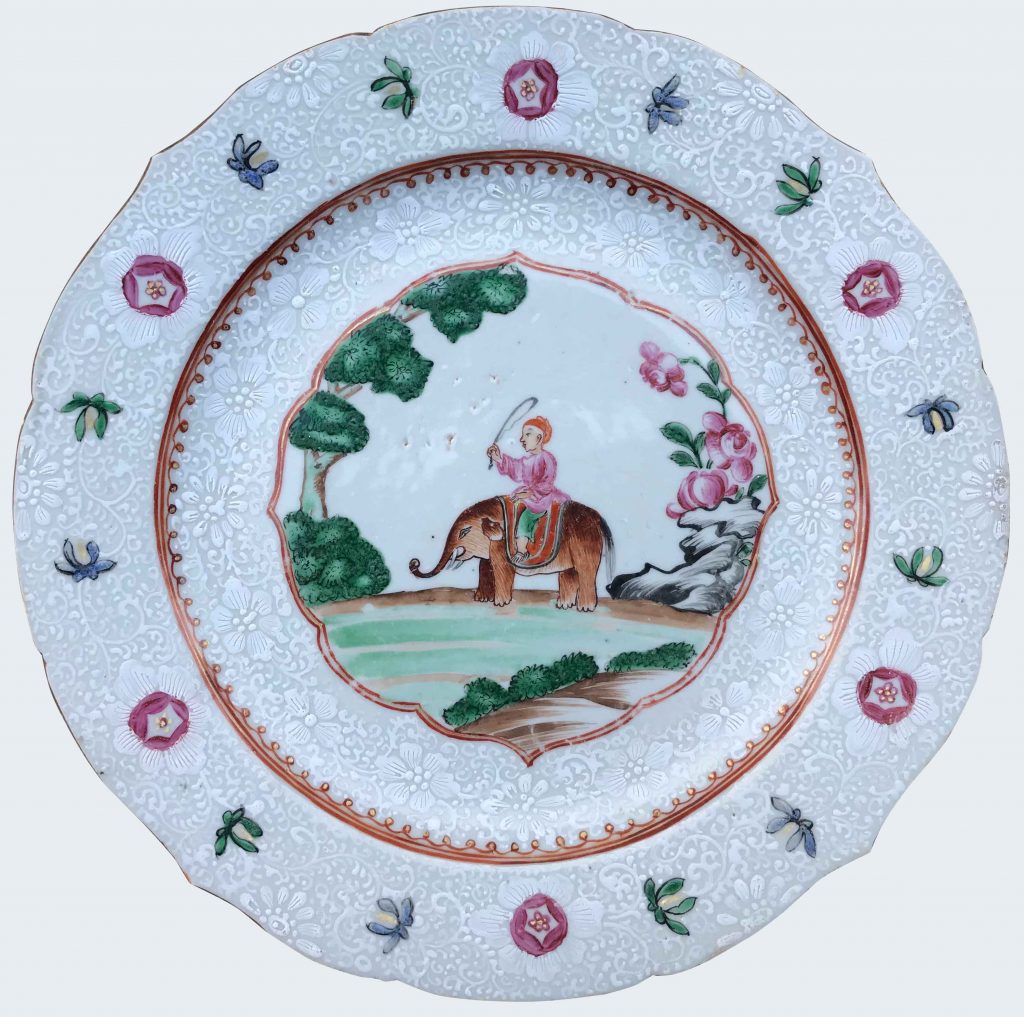 A Chinese famille rose plate decorated with elephant and mahout for the Indian market. Qianlong period.