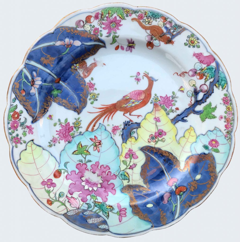 Of barbed and lobed outline, enameled with the classic pattern in vivid famille rose colors, underglaze blue and gilt, a very large passion flower in pink and yellow shown against the leaves.