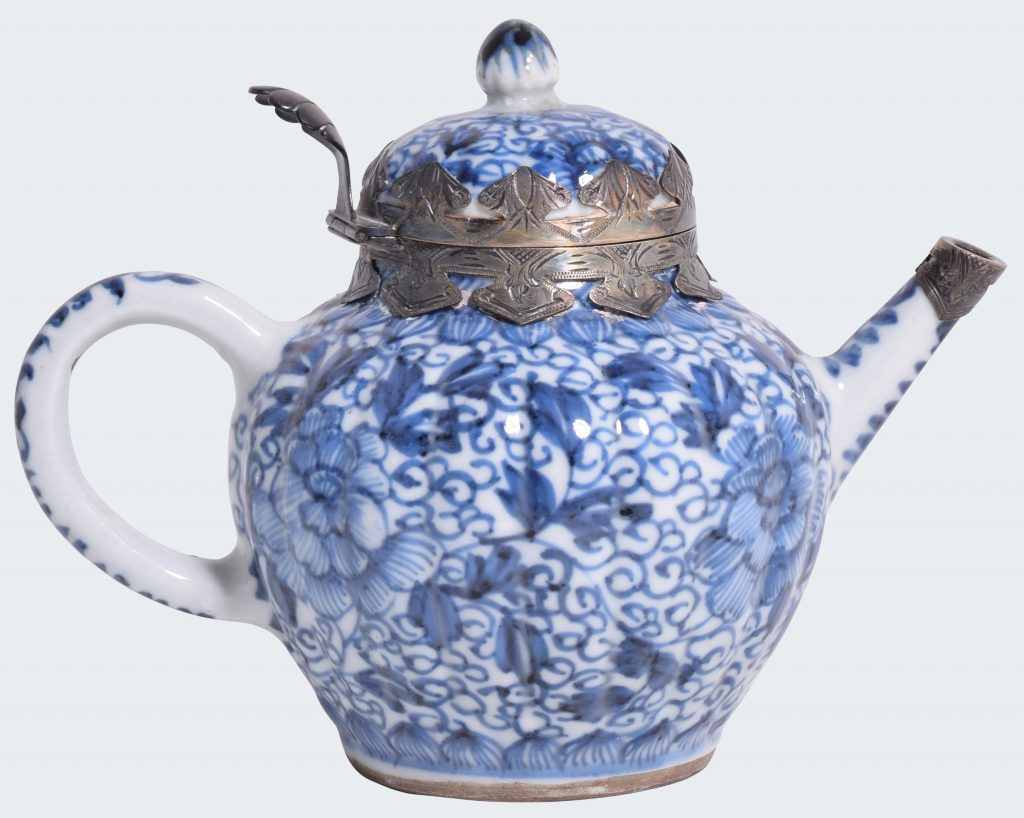 A Chinese blue and white teapot with Dutch silver mounts. Qianlong period.