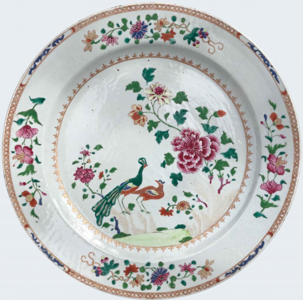 A massive Chinese famille rose charger from the “Serviço dos Dois Pavões”. Qianlong period.