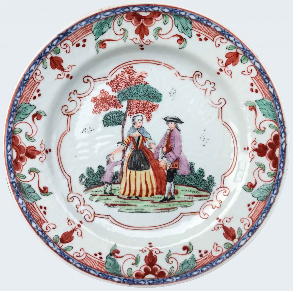Decorated in characteristic palette, with a couple walking in a garden in the centre, the lady with her right arm extended placing her hand on the head of the infant at her side, the scene enclosed within a ban of scrolls and a formal border encircling the rim.