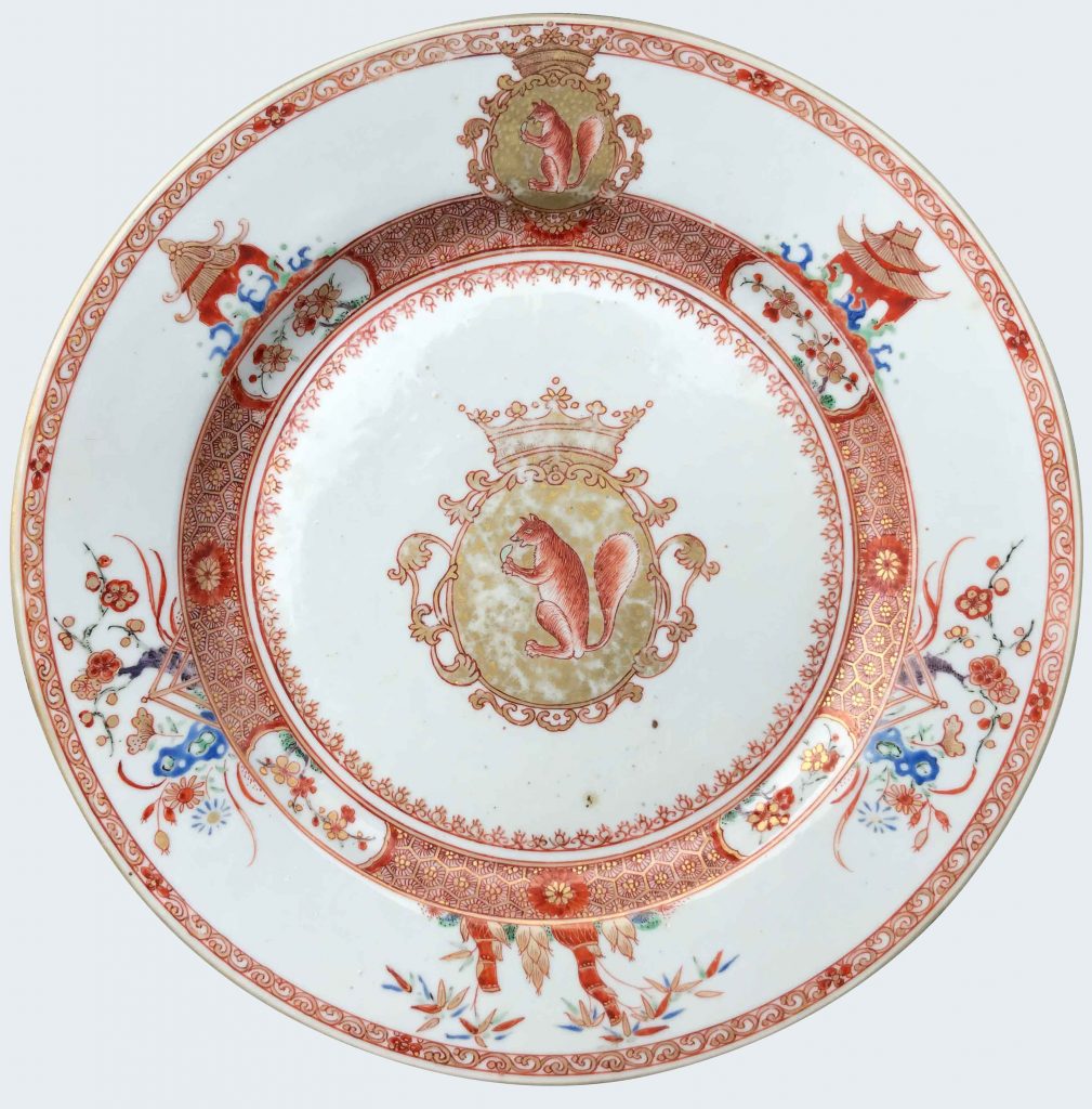 Decorated in rouge-de-fer and gold with brown, green, purple and blue. On the rim, there is a spiraling scroll border with bamboo, two groups of flowering plants and a gate, two Chinese pavilions or pagodas and above a coat of arms repeated. At the cavetto, there is a honeycomb diaper border with four reserves filled […]