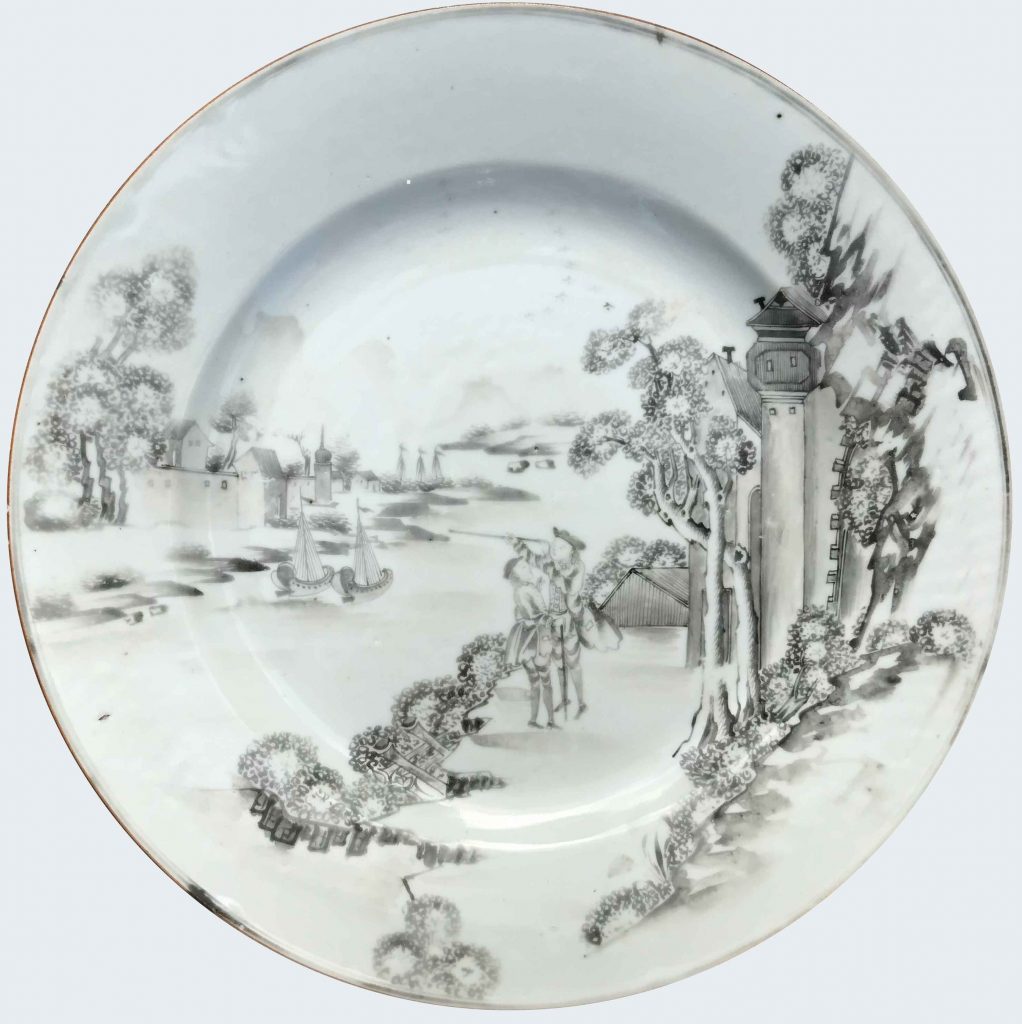 A Chinese “en grisaille” plate decorated with Dutch people looking at a landscape. Qianlong period.