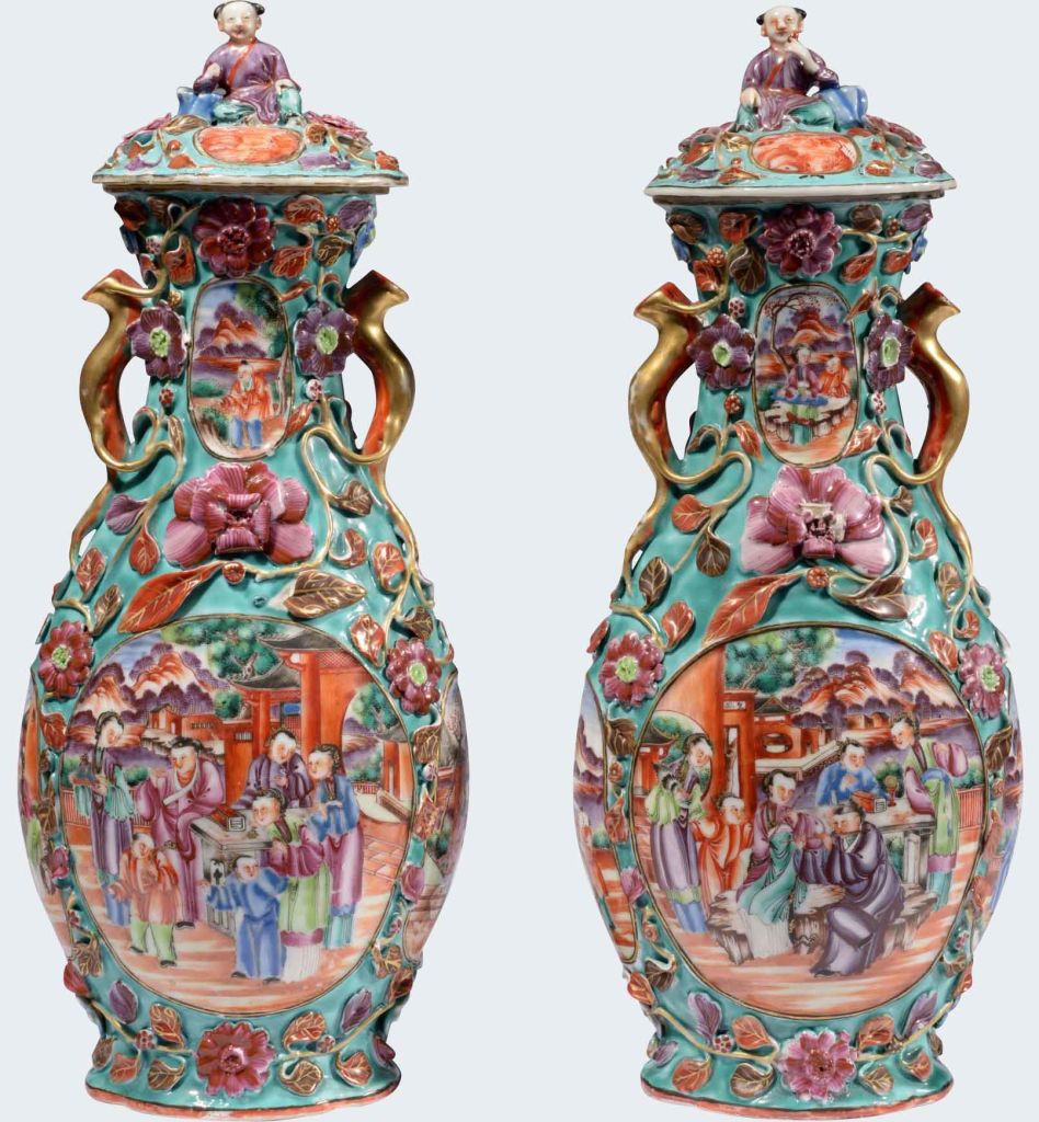 Of flattened baluster form, decorated in the famille rose palette, with pairs of gilt branch handles ‘growing’ into applied leafy flowering vines, panels front and back painted with Chinese domestic scenes in ‘Mandarin’ colors, the knops boys seated by blue rocks.