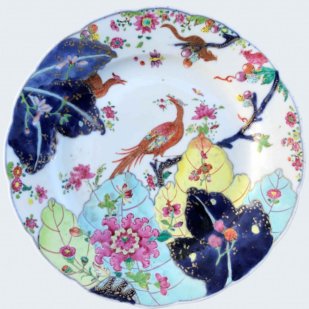 Enamelled in a rich famille rose palette with a peacock and a peahen standing on a grassy hillock beside blue weathered rocks growing with large pink peony, smaller flowers in gilt and colors growing alongside, all within a series of iron-red borders trailing similar blooms and interrupted by dark grey ground lappets edged in green […]