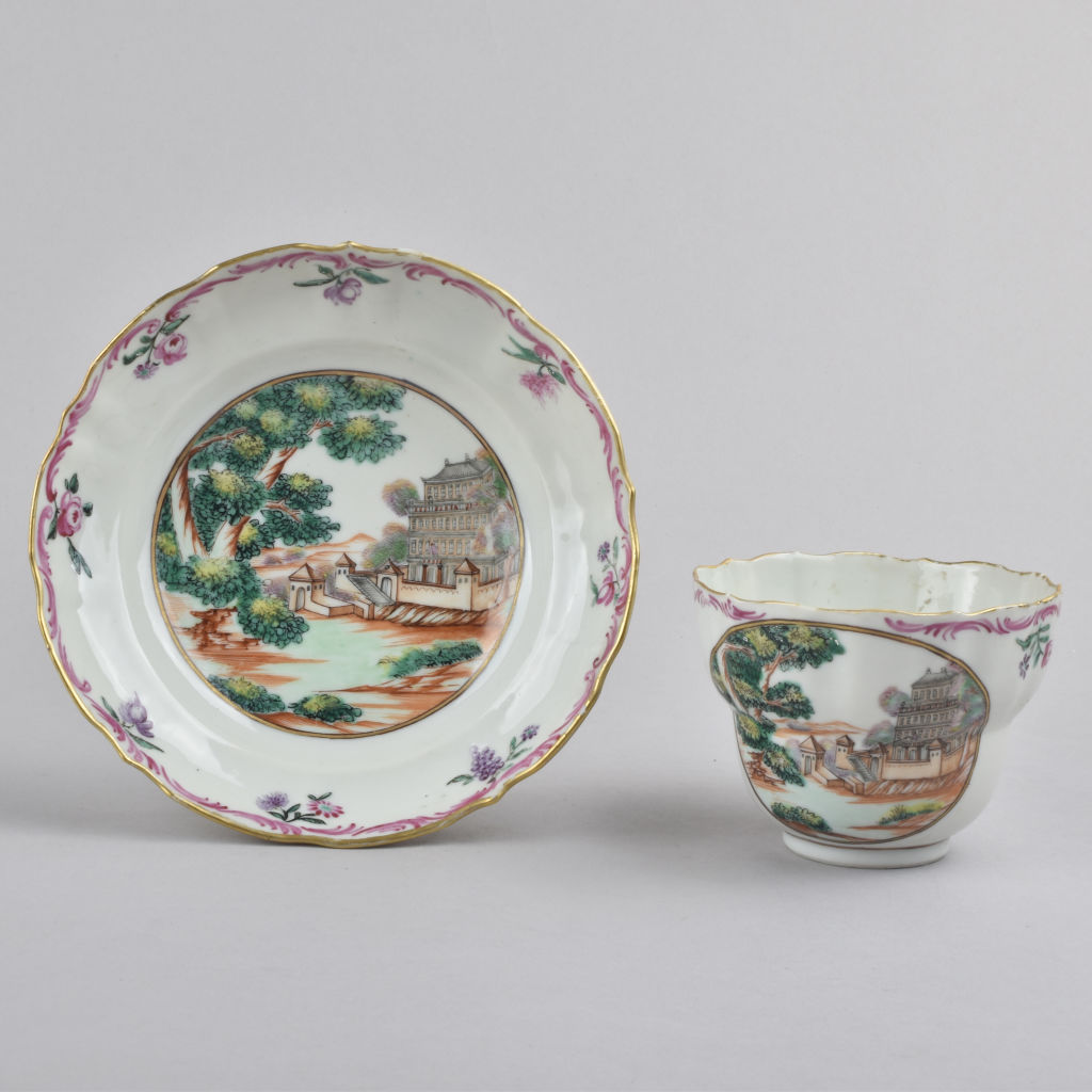 Decorated in the famille rose palette, in overglaze polychrome enamels, including pink, green, iron red, black and gold. At the centre is a large medallion with a wavy frieze framed by gold circles enclosing the bust-length portrait of the Roman goddess Minerva wearing a Corinthian helmet in a pink ground. There is also a pink […]