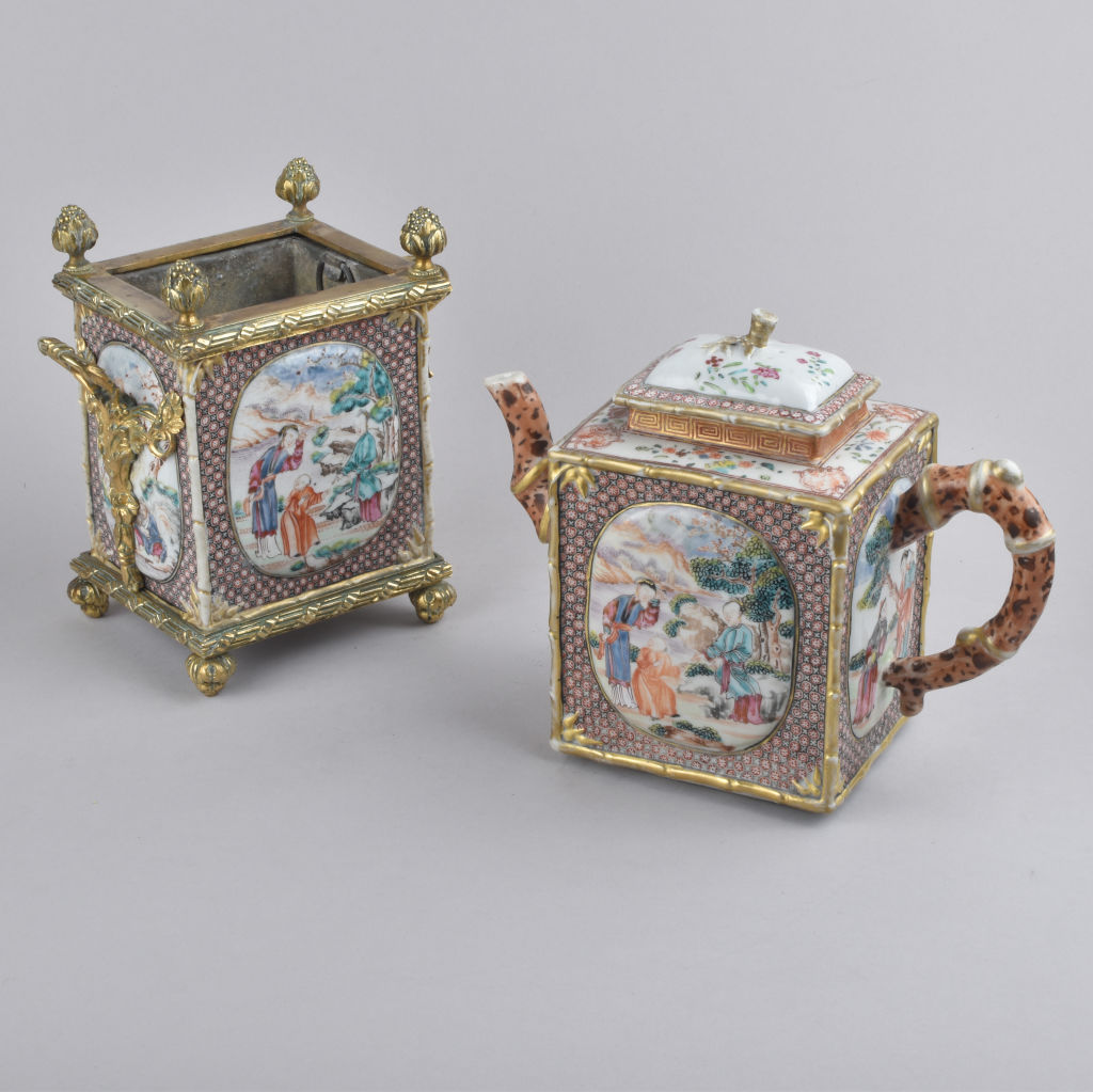 A Chinese famille rose mandarins square teapot and a jardiniere. Qianlong
