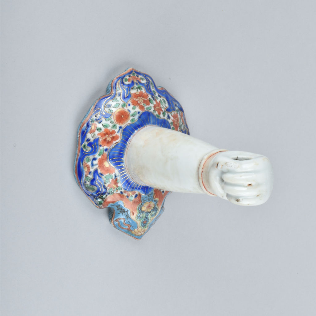 Shaped like a human arm, protruding from a flat base which forms a sleeve. The hand is partially clenched to provide a hole in the middle, through which a metal candlestick could be fitted. The sconce is decorated in overglaze enamels of the famille rose palette, including green, blue and red. The arms is painted […]