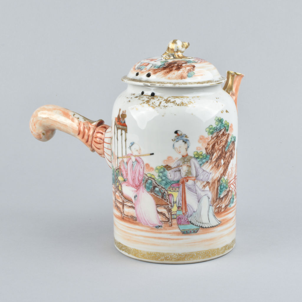 Of cylindrical form, with rococo spout and pistol grip handle set as right angles, the cover with strawberry finial, and decorated in the famille rose palette with ladies and children in garden.