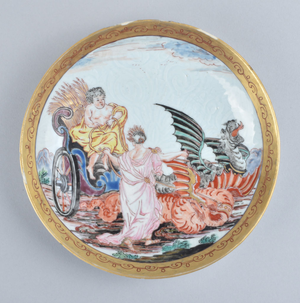 A Chinese porcelain dish, with a glaze porcelain carved with scrolling foliage, and decorated in Holland after the engraving of Bernard Picard (1673-1732) for Ovid’s Metamorphoses (1732) and depicting Demeter (Ceres) relinquishing her dragons to Triptolemus.