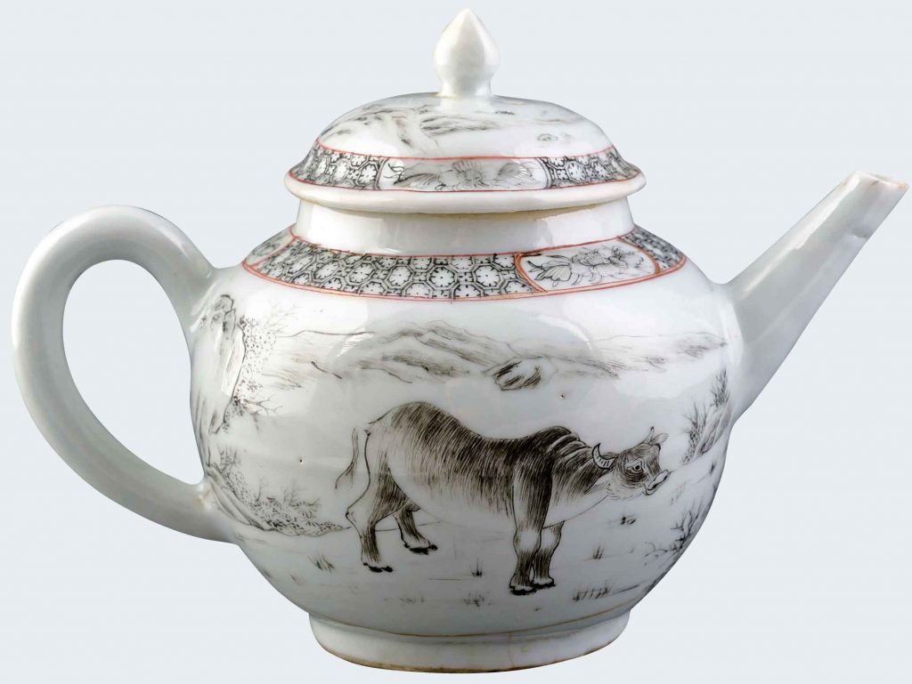 A Chinese Encre de Chine teapot decorated with a water buffalo. Yongzheng period.