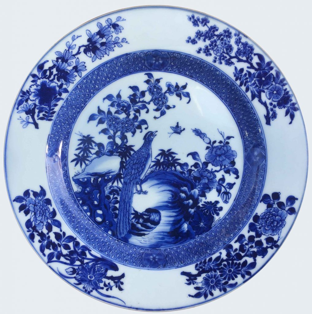 A Chinese blue and white dish decorated with a peacock. Yongzheng period.