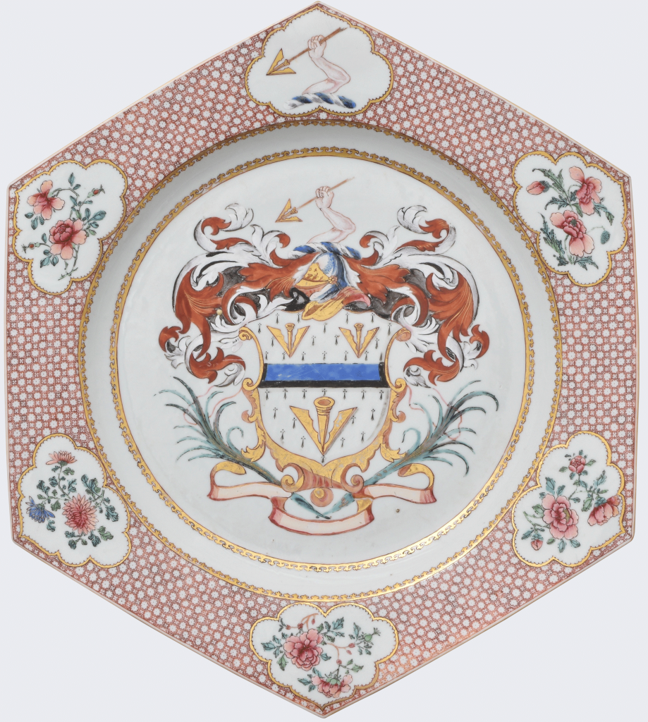 Très grand plat armorié hexagonal pour le marché anglais en porcelaine de Chine d’époque Yongzheng