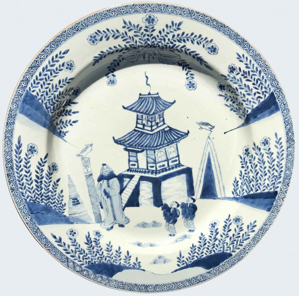 Très grand plat à décor blanc et bleu peint d’une pagode et de figures en porcelaine de Chine d’époque Kangxi