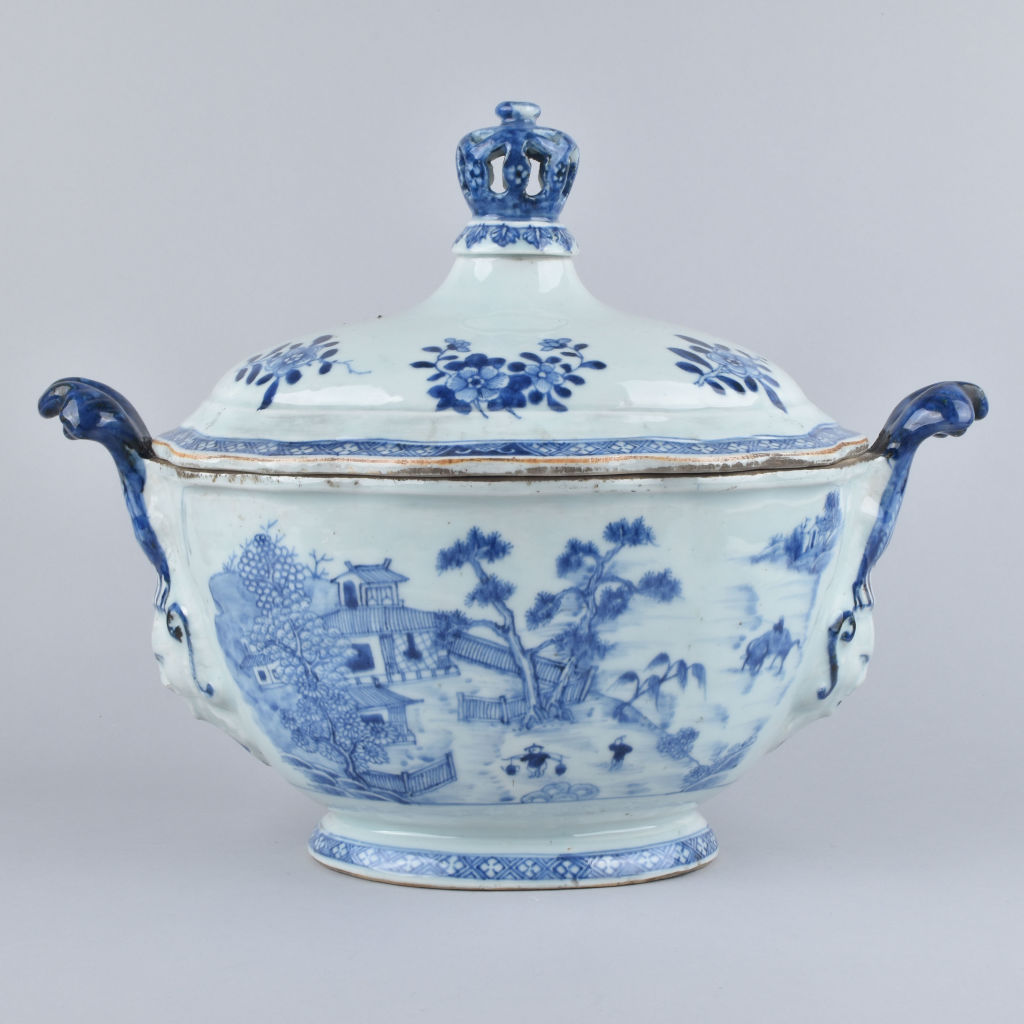 Décorée en bleu sous couverte, avec des poignées en forme de têtes de lapin, le couvercle avec une couronne fermée d’après un modèle de Meissen.