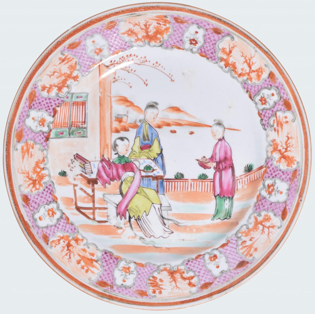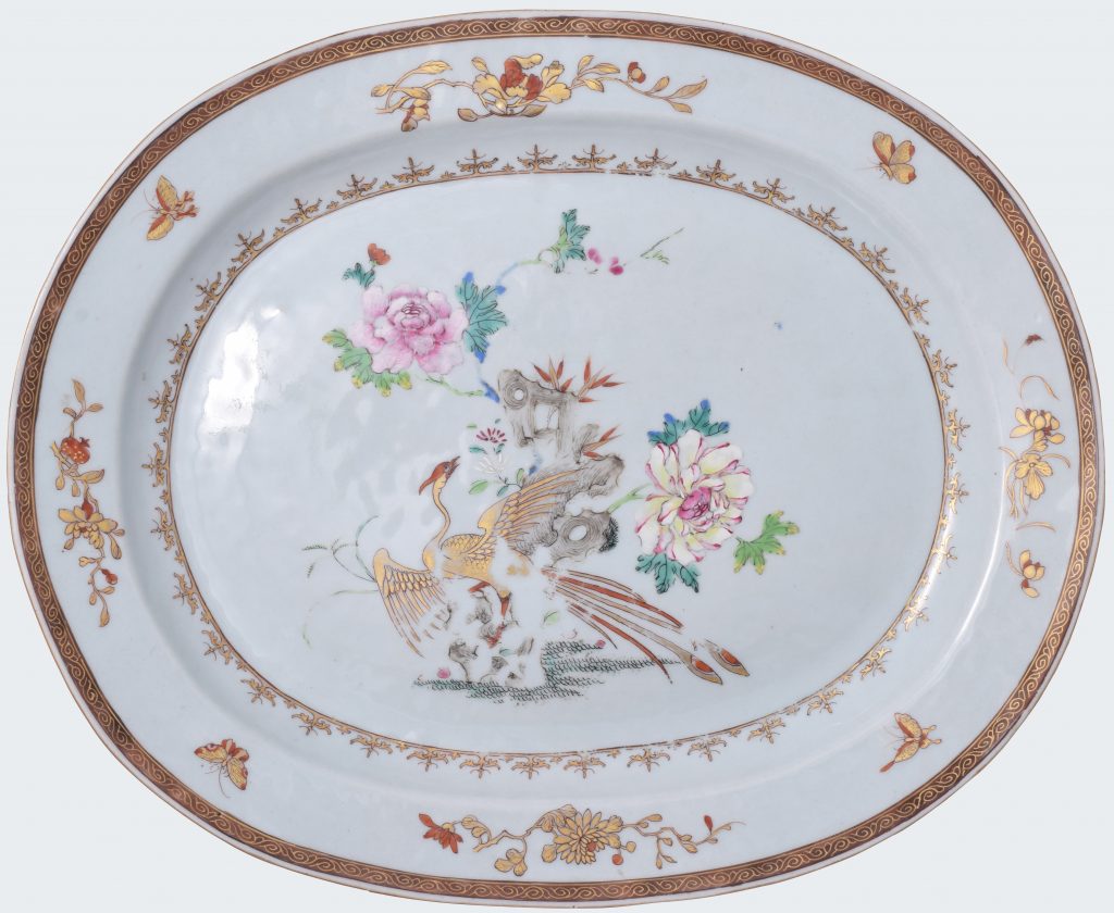 Décorée dans la palette de la famille rose, avec l’image classique d’un coq parmi les rochers et les branches fleuries de fleurs de pivoine et d’oeillet. Frises de treillages sur le col et le couvercle.