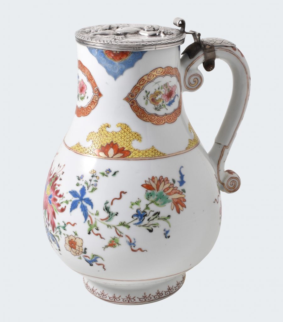 De forme conique, avec un haut couvercle pointu en forme de dôme, et un bec octogonal effilé. Le décor, spécialement conçu en Europe, d’écailles vert turquoise divisées par une large bordure blanche décorée de papillons et d’insectes au-dessus d’une bordure noire en forme de fleurs de la famille rose, le couvercle décoré de la même […]
