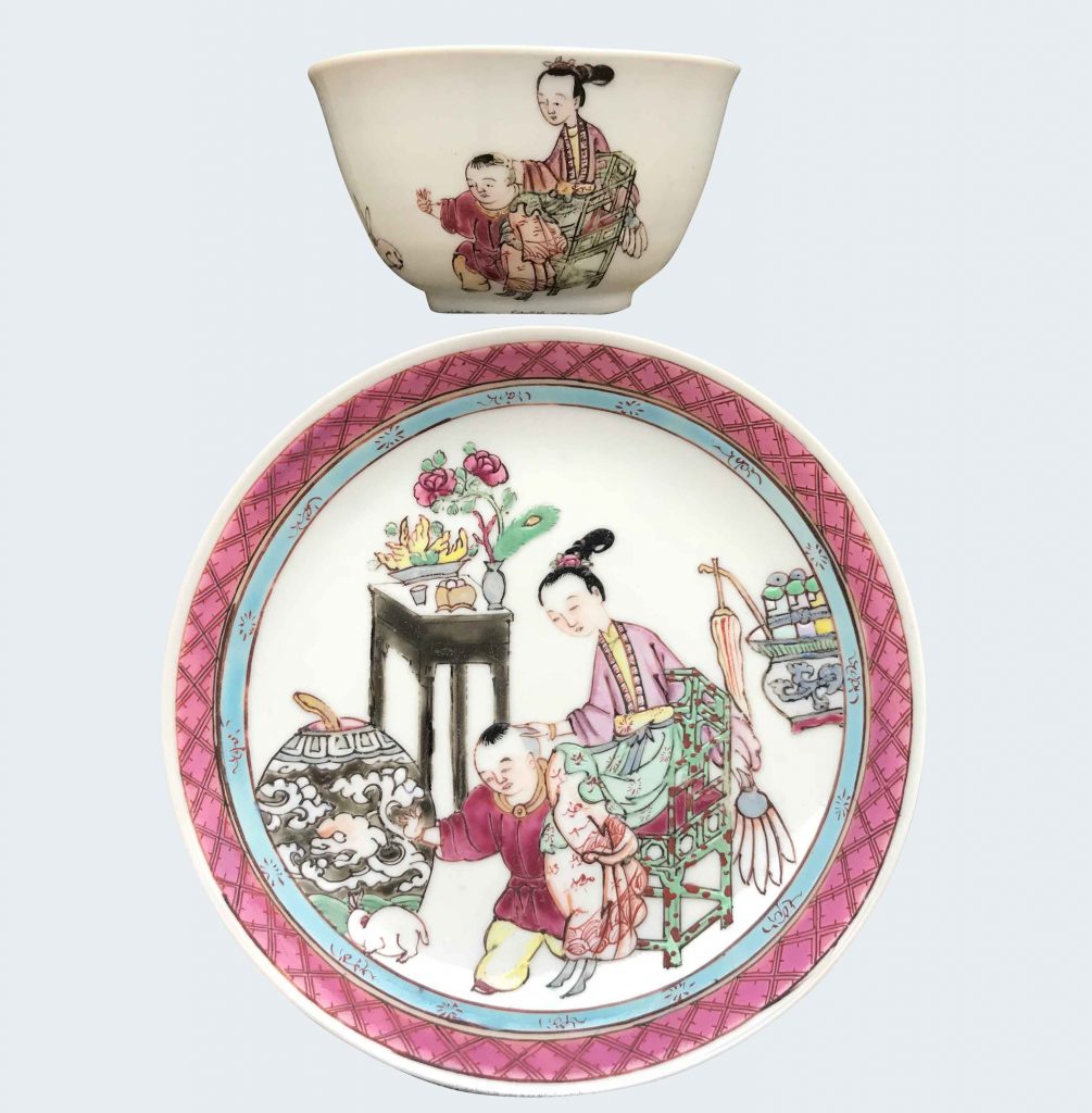 A décor réticulé sur l’aile, le centre peint d’une élégante chinoise avec ses deux enfants.