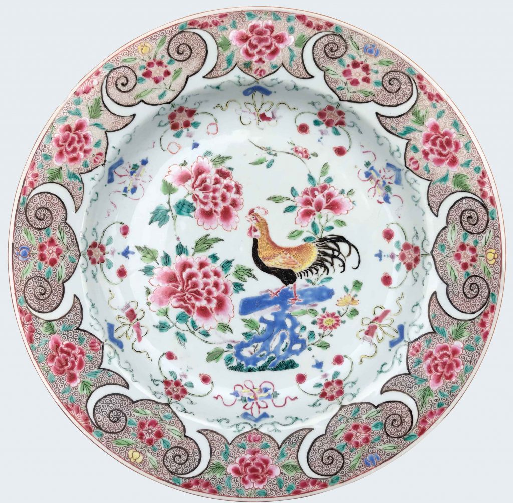 Très grand plat à décor d’un coq en porcelaine de Chine d’époque Yongzheng