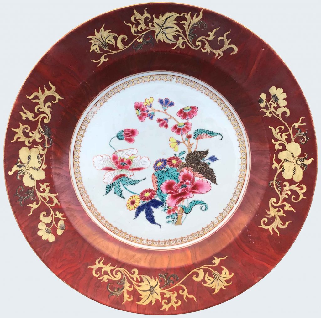 Décoré des émaux de la famille rose et rouge de fer, au centre avec un parchemin déroulé montrant une scène avec une corbeille de fleurs et un sceptre ruyi, entre des branches de prunus et de pivoines, l’aile à décor de cartouches avec des figures chinoises.