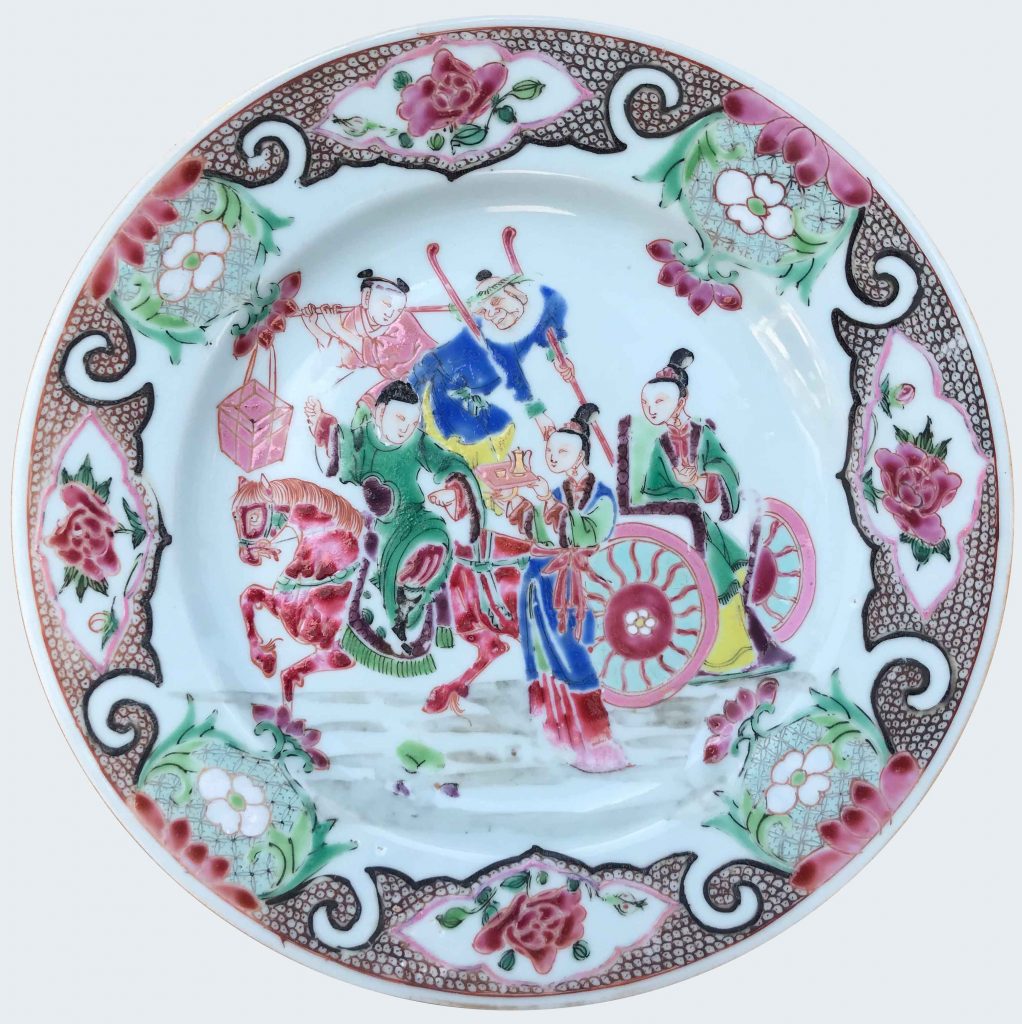 Peinte dans les émaux de la famille rose, à décor représentant un homme montant à cheval, avec une élégante chinoise accompagnée par ses serviteurs. Sur l’aile, fond d’oeufs de poissons et lambrequins.