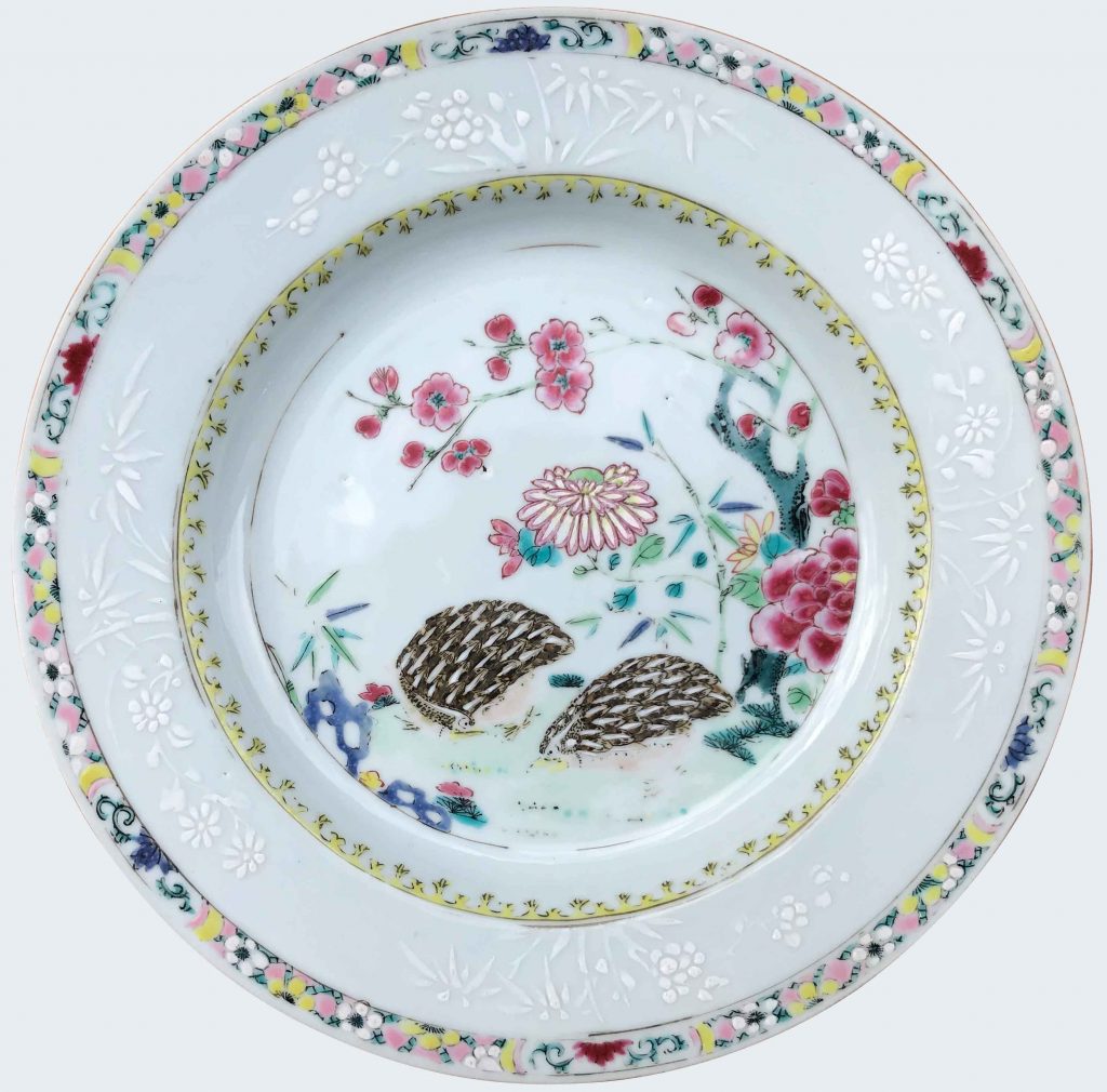 Peint dans les émaux de la famille rose, à décor de deux paons parmi des pivoines et un rocher percé. Sur l’aile, frise de treillages.fa