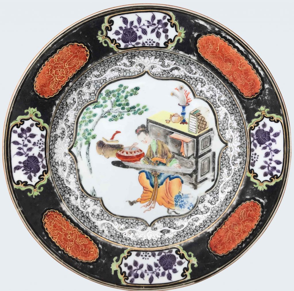 Peinte dans les émaux de la famille rose, le centre avec un médaillon quadrilobé renfermant une jeune élégante chinoise jouant de la cithare qin, à coté d’un cabinet. A sa droite, deux vases et un arbre. Le médaillon est réservé sur un fond en grisaille. Sur l’aile, un décor de quatre cartouches.