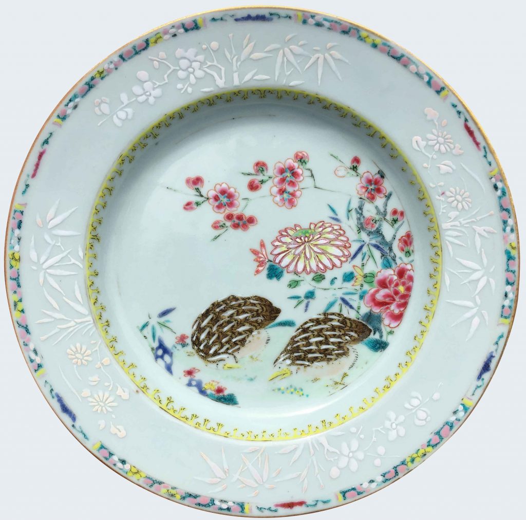 Peinte dans les émaux de la famille rose à décor de deux cailles à coté de chrysanthèmes, sur l’aile, un décor en bianco-sopra-bianco.