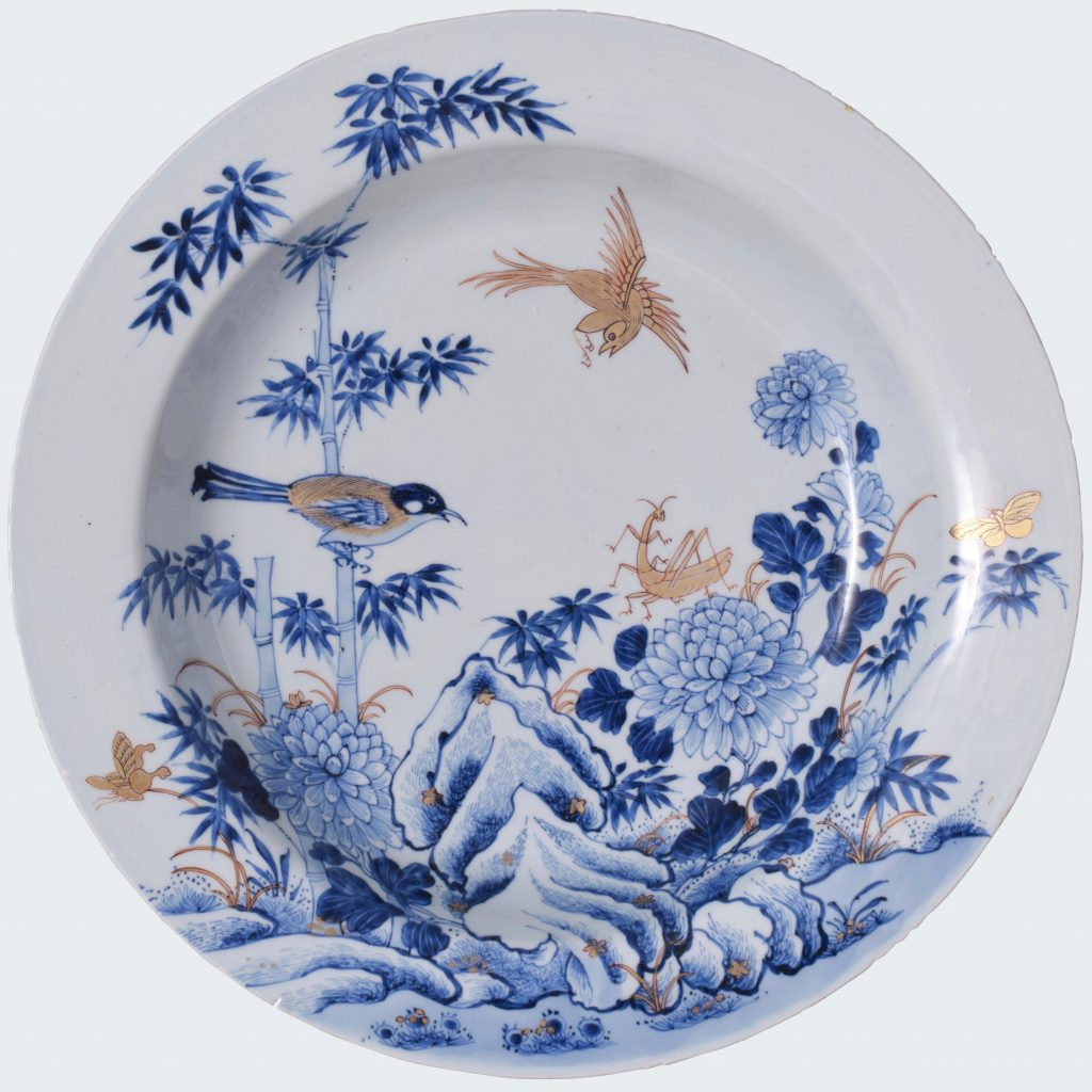 Peint en bleu sous couverte à décor de deux oiseaux virevoltant autour d’un insecte.