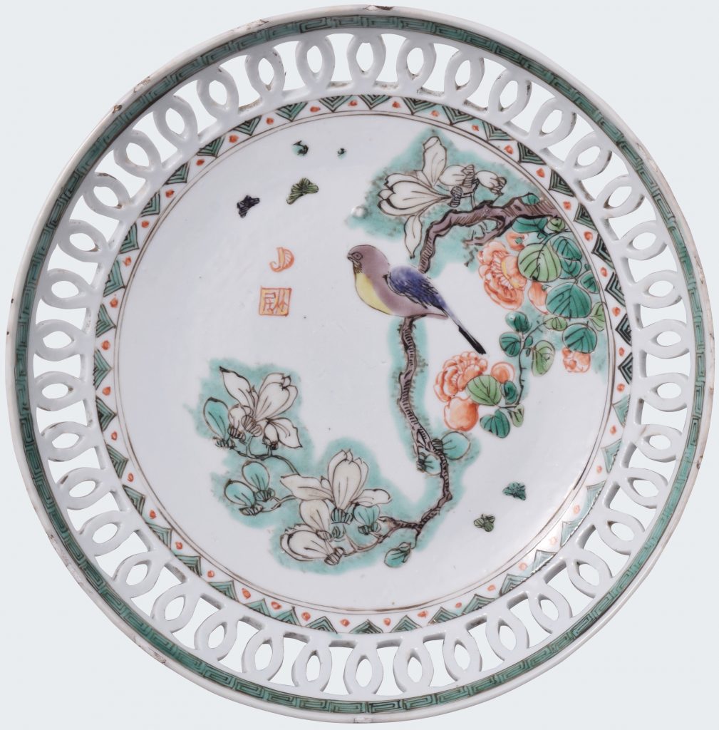 De forme circulaire, la bordure percée de cercles enchevêtrés, décorées dans la palette de la famille verte d’une pie sur une branche de prunus et de pivoines.