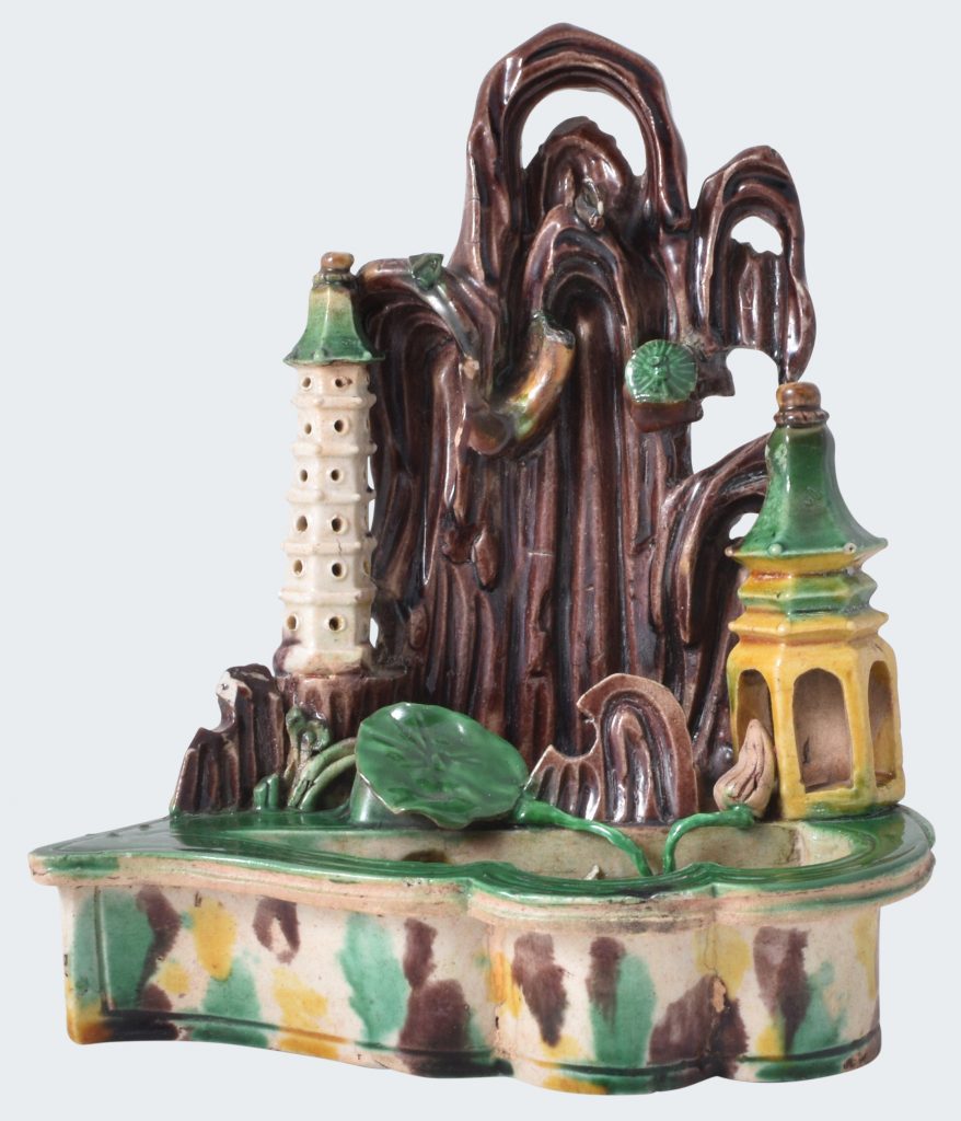 Peinte dans les émaux de la famille verte, avec des plantes issues d’un rocher percé.