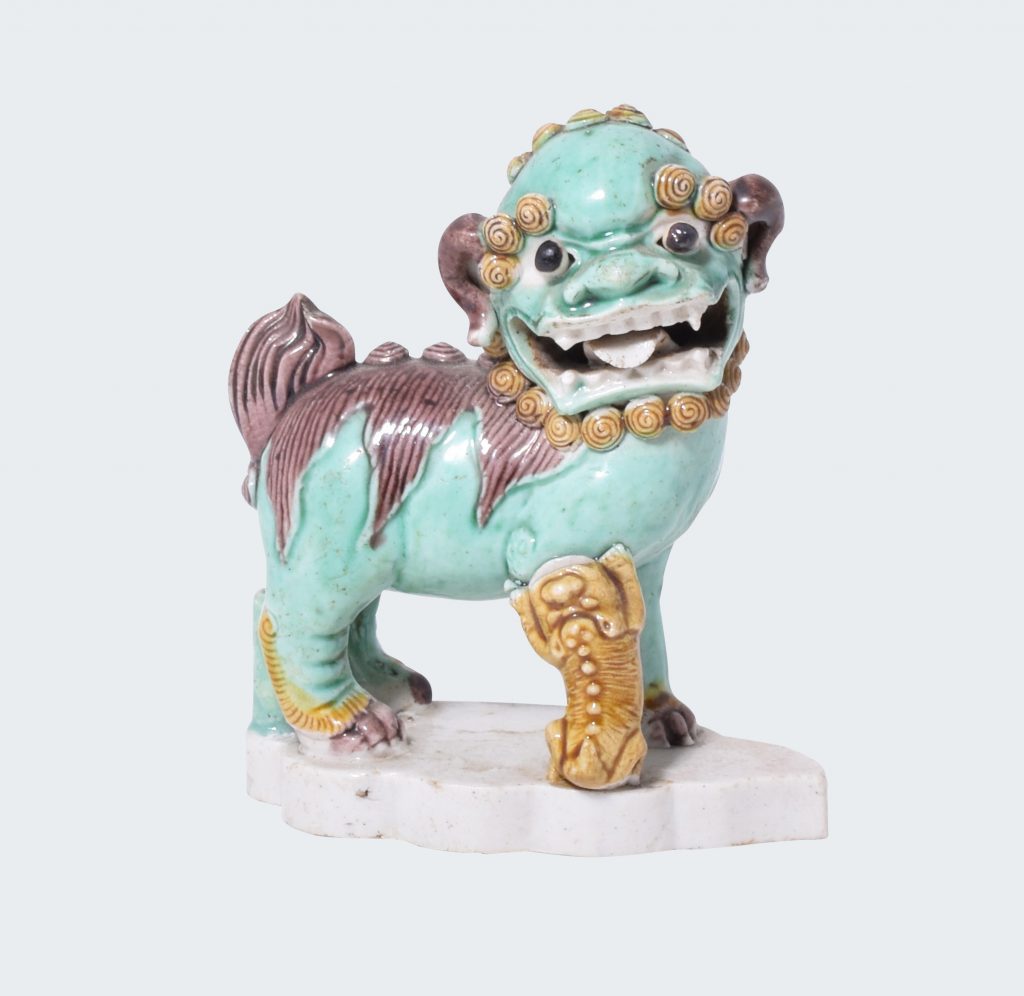 Décoré dans les émaux de la famille verte sur le biscuit, debout sur quatre pieds et regardant vers la droite, avec des globes oculaires mobiles sur une base en forme de feuille d’armoise.