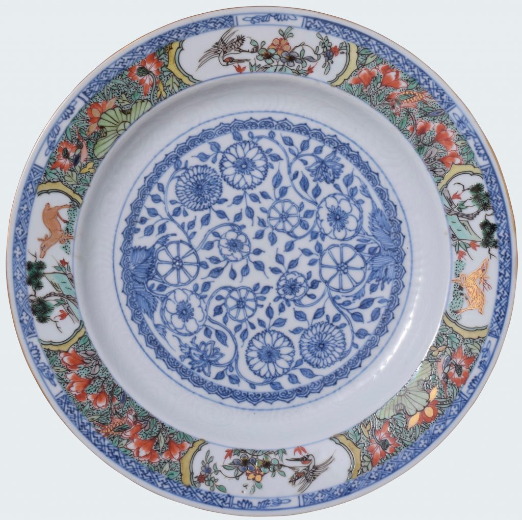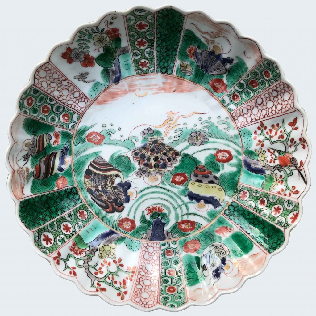 De forme polylobée, décorée d’émaux rouge-de-fer, or et peinte dans les émaux de la famille verte, avec une divinité portant une gerbe de fruits sur une terrasse, tandis qu’un cerf tacheté jaune court à ses côtés, levant les yeux. L’aile peinte en rouge-de-fer et en or, le dessin imitant les porcelaines à décor Kraak.