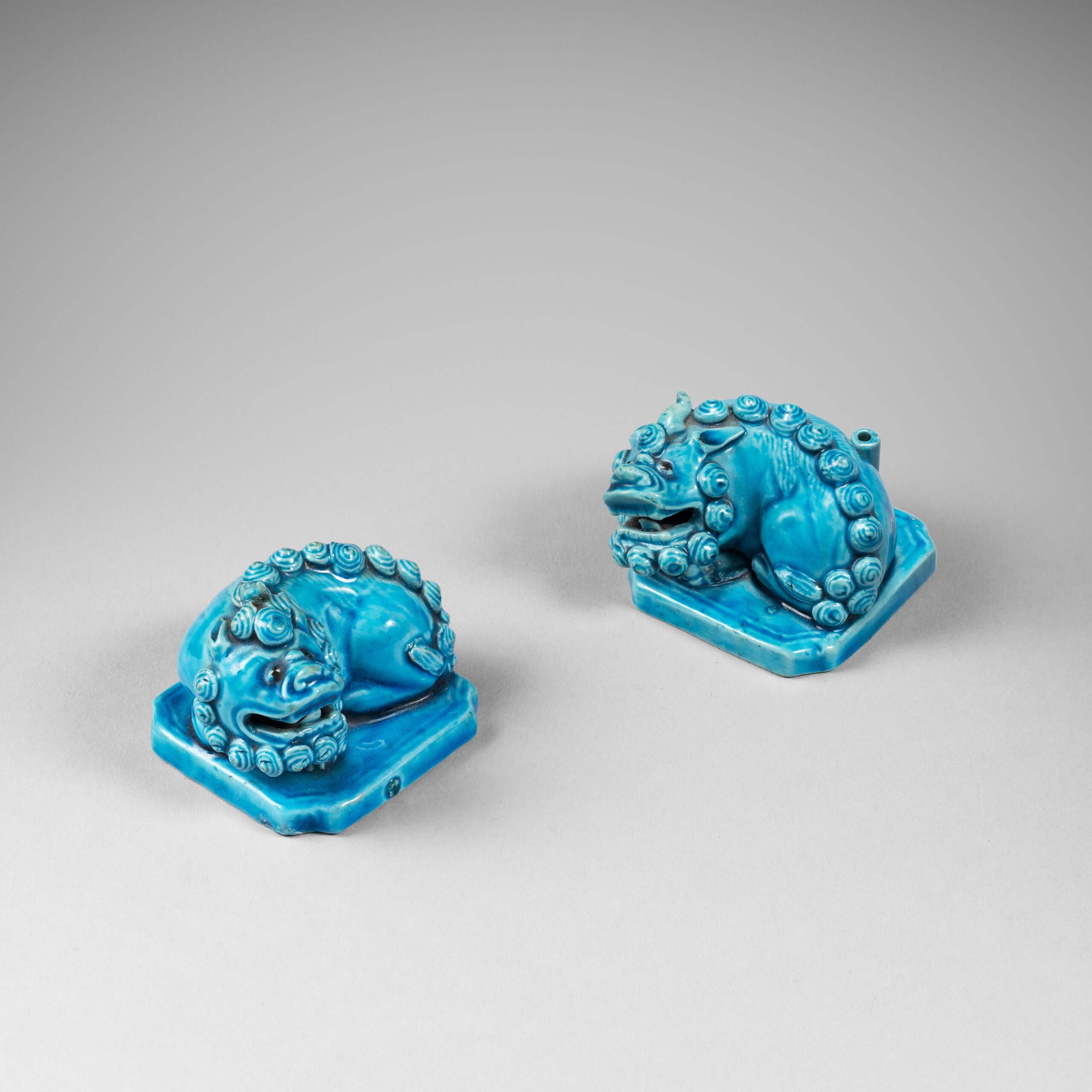 Paire de porte-encens lions bouddhiques émaillés turquoise. Chine, Kangxi